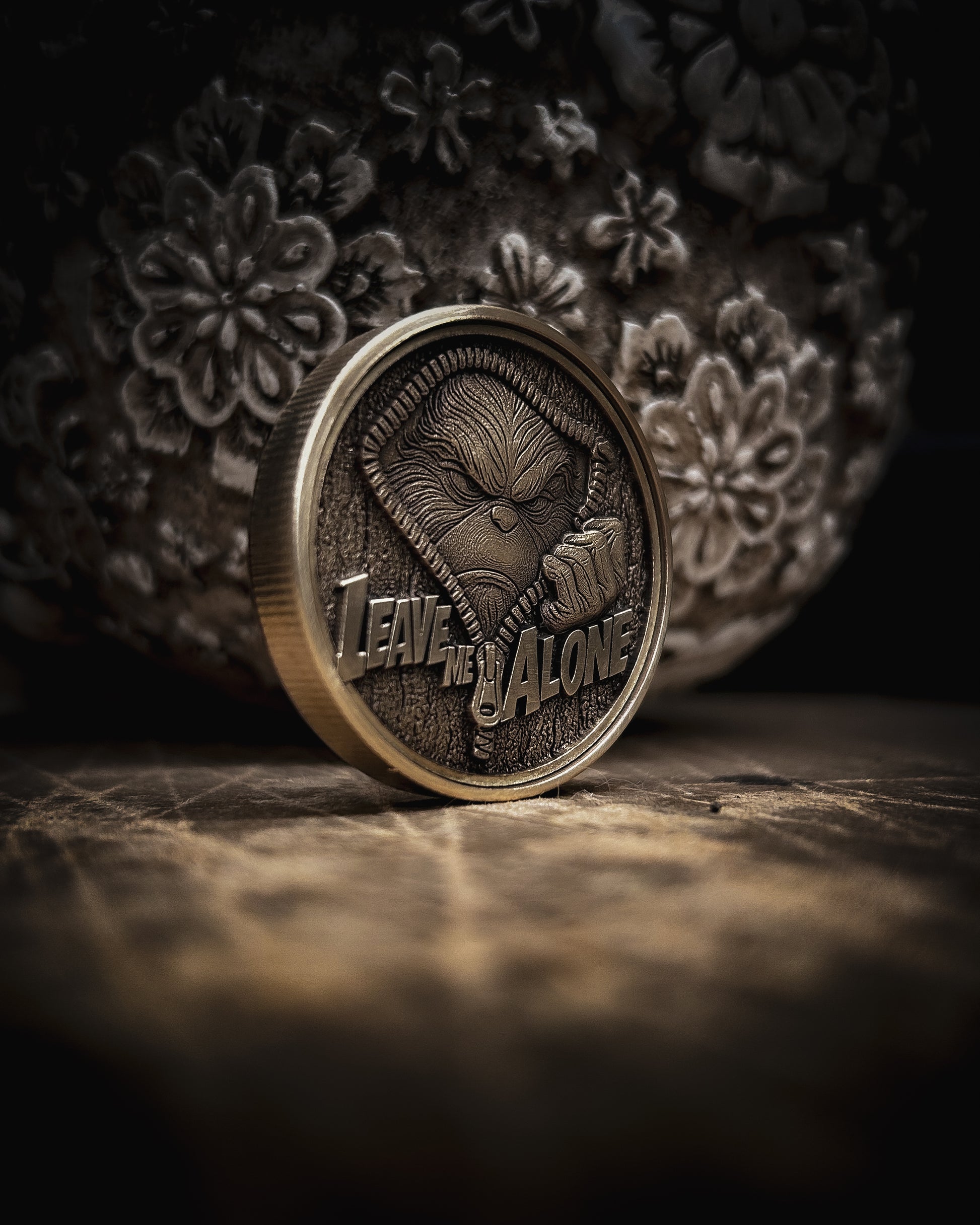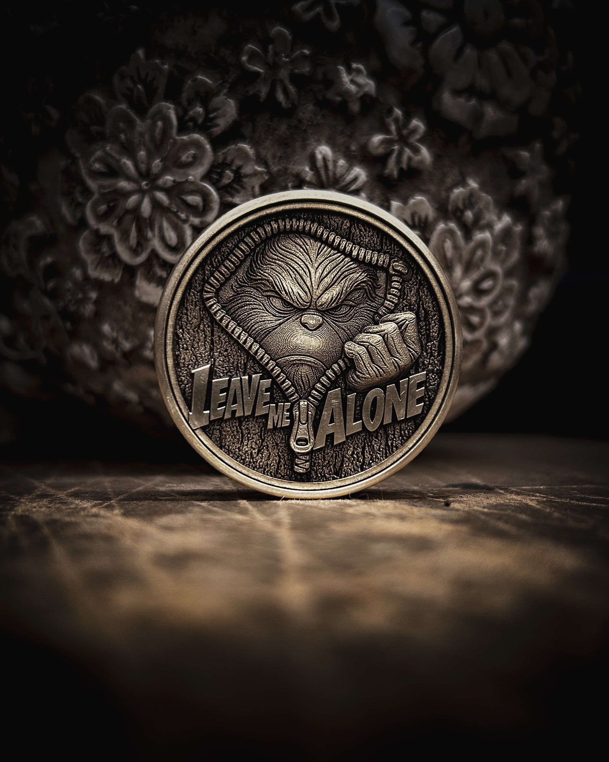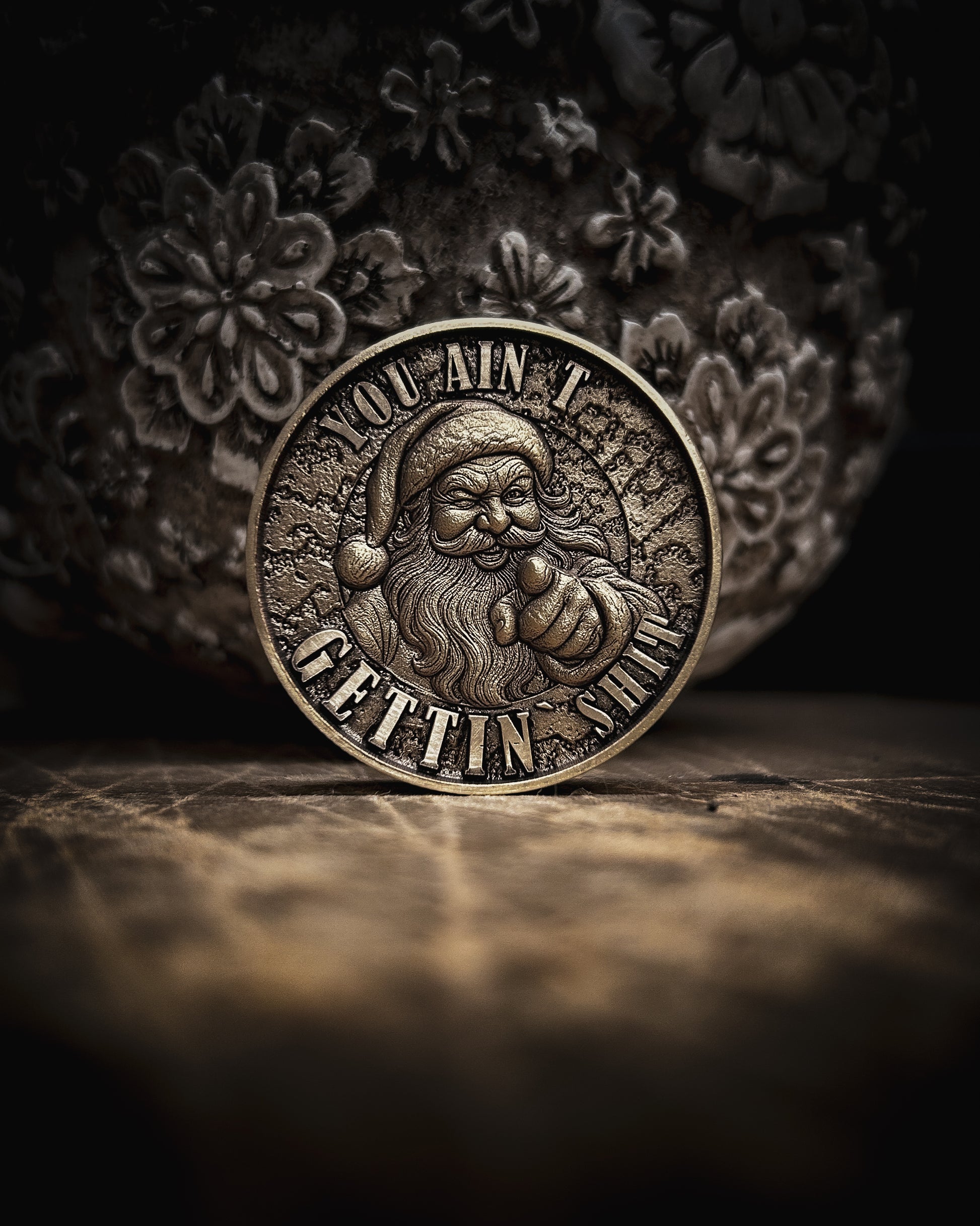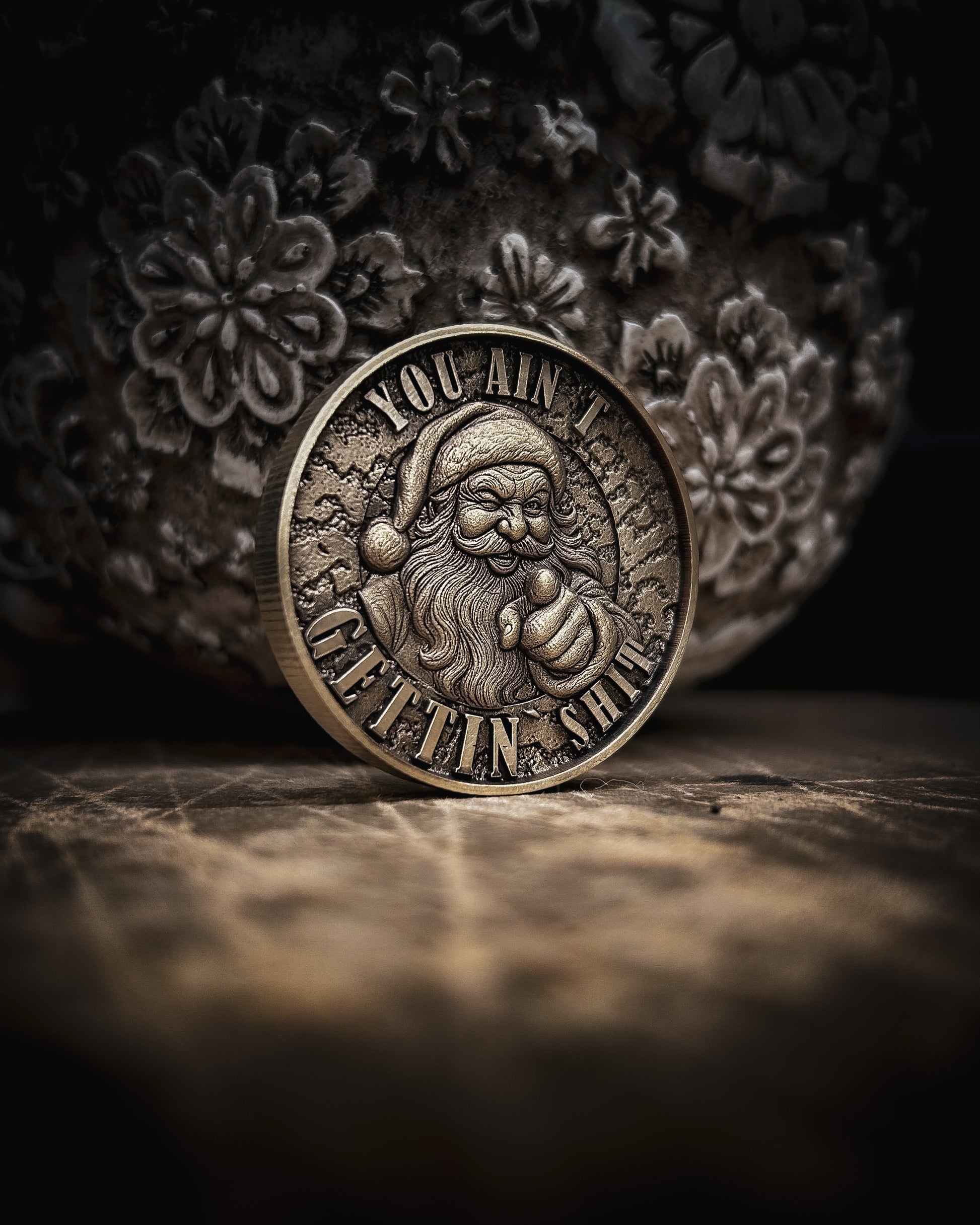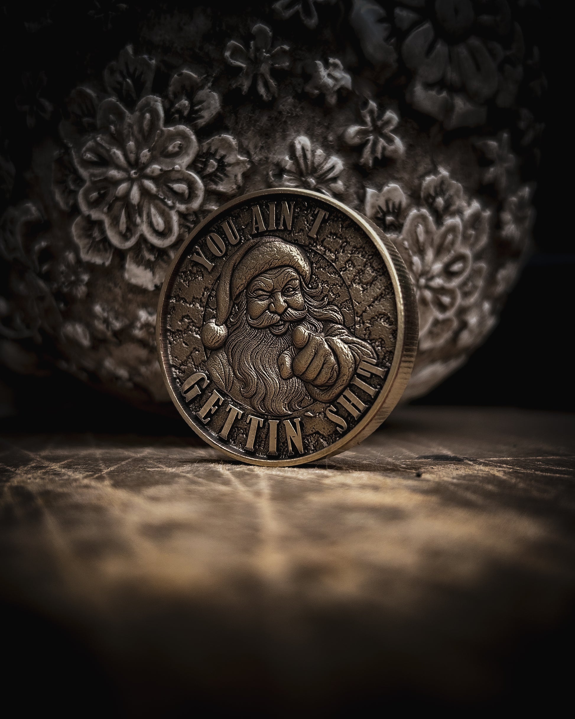 This double-sided solid brass coin is made for anyone who appreciates honest humour and bold engraving. One side delivers the classic “Leave Me Alone” expression carved in deep relief, while the reverse features a no-nonsense Santa reminding everyone: “You Ain’t Gettin’ Sh*t.”
