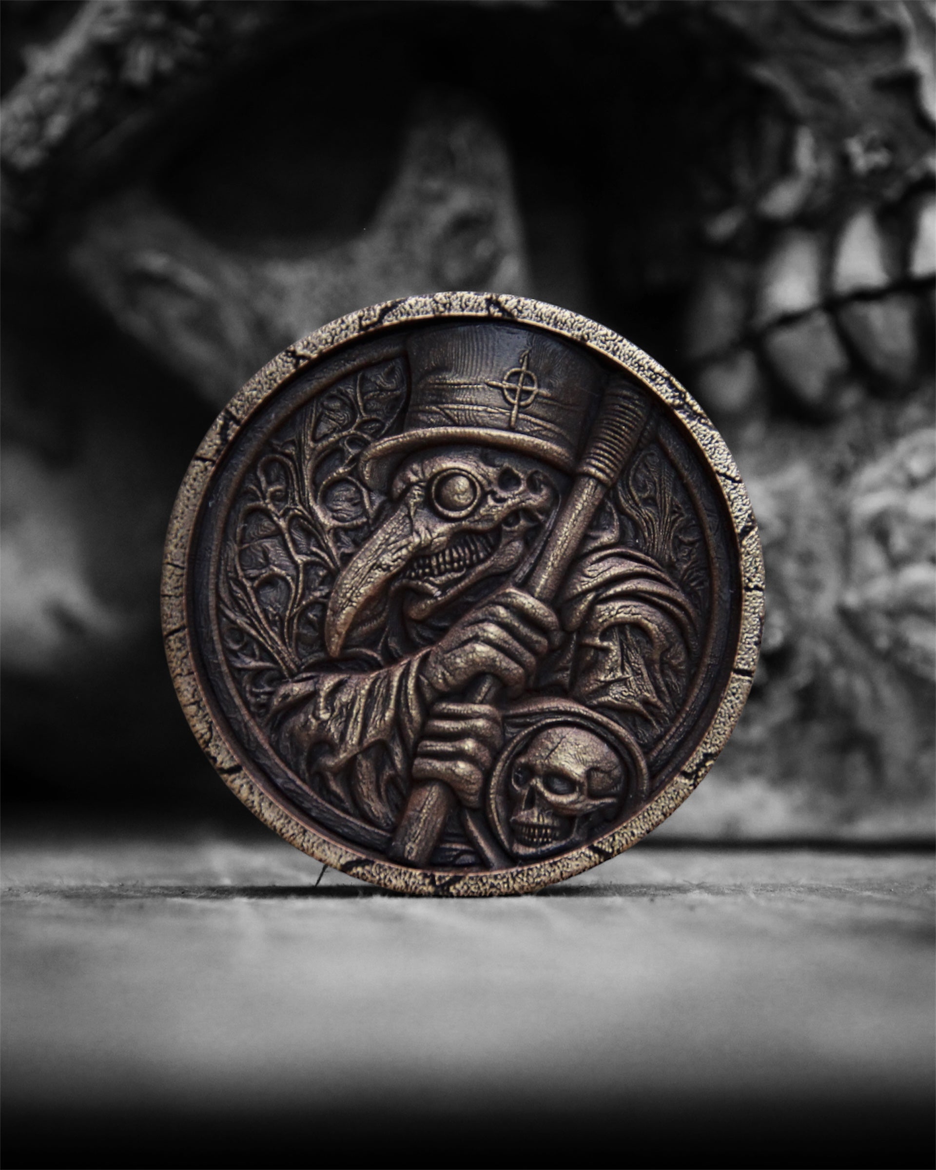 Each side is deeply engraved and hand-finished to create strong contrast, texture, and shadow, giving the coin the feel of an aged relic from another era.