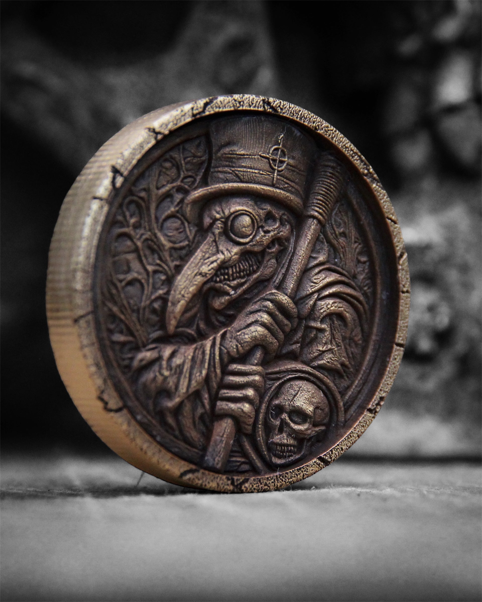 The Plague Doctor Brass Coin is a double-sided solid brass collectible inspired by medieval plague symbolism, mortality, and endurance.
